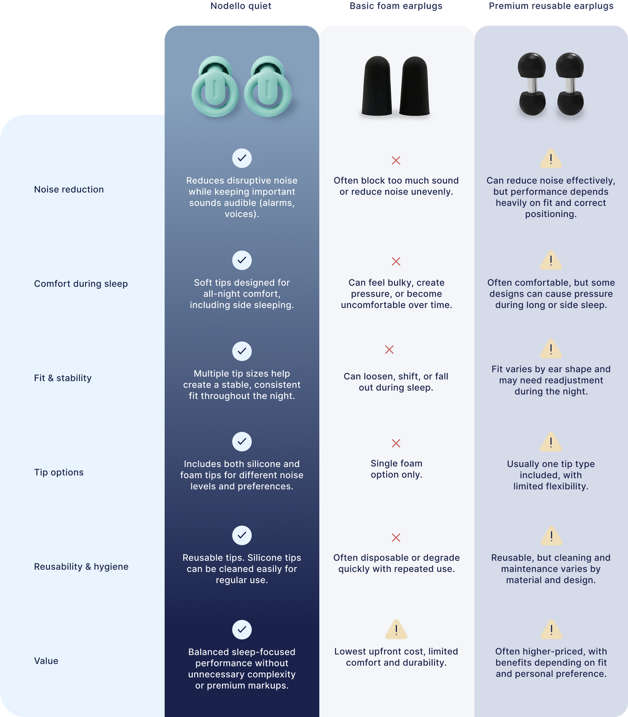 Nodello Quiet is reusable and designed for long-term comfort. Instead of fully blocking sound, it reduces noise intensity, which many people find more natural and less isolating overnight.